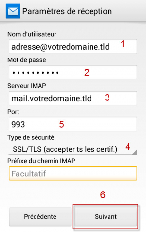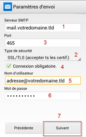 - Type de sécurité : SSL/TLS (accepter tous les certificats)