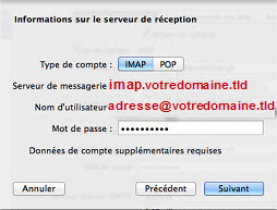 - Nom d'utilisateur : adresse@votredomaine.tld (adresse e-mail complète)