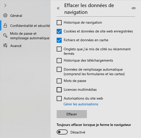 - Cochez les cases face à Cookies et données de site" et Images et fichiers en cache.