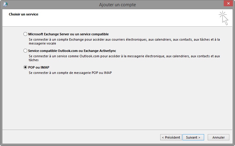 Cliquer POP ou IMAP, puis cliquer Suivant