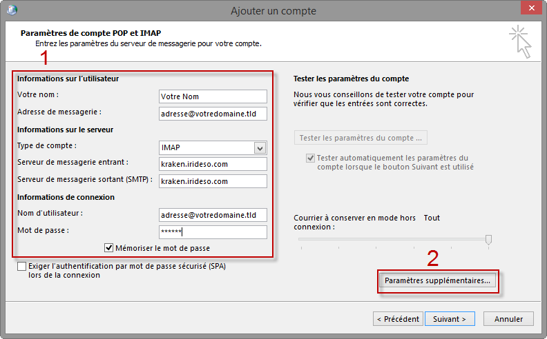 Remplir les informations nécessaires, choisir le Type de compte IMAP et cliquer Paramètres supplémentaires…