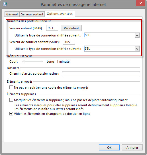 - Utiliser le type de connexion chiffrée suivant : SSL